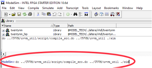 UVVM can be compiled by calling the UVVM/script/compile_all.do file using simulator GUI or from the command line. This will